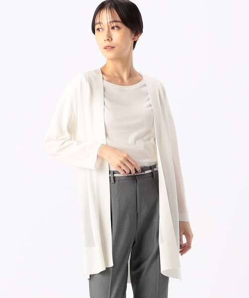 《デザイン》均一な編み目が美しく、薄手ながら適度なはり感と透け感が洗練された印象のロングカーディガンです。ボタンレスでさらっと羽織ることができるので、腕を通さずに肩に掛けたりスタイリングのアクセントにもなります。襟から前たては編み続き仕様で、縫い代のごろつきがありません。ベーシックカーディガンと違い、シンプルながらドレープのあるシルエットが大人っぽく優雅でオンオフ幅広く活躍します。《素材》トレンドの光沢素材です。原料は柔らかなトップ染めのビスコース繊維極細の多色スパークフィラメントのポリエステルを撚糸した糸です。ラメとは違う上品な光沢が特徴で、透け感がありつつも編地にはりがあるので肌離れの良い爽やかな素材感です。
