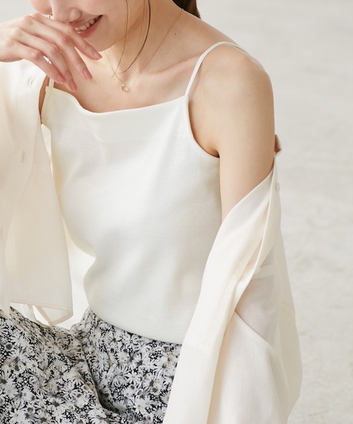 ストラップでアレンジを楽しめる。3WAYキャミソール。【素材感】 ・暑い時期でも快適な着心地、さらに安心感のある程よい厚さにこだわった1枚。 ・身体のラインを拾いにくく、優しくフィットしするテレコ素材。 ・カジュアルすぎないように細めのテレコに。 【デザイン・シルエット】 ・フラットライン胸もとが安心のキャミソール。 ・ダブルストラップは外したりクロスしたりできる3WAY。 ・レイヤードがしやすいカップなし。 ・肩紐は調節可能なのでお好きなフィット感で着用可能。 【カラー】 ・ブラック、オフホワイト、グリーンのすっきりとした3色を展開。 【スタイリングポイント】 ・タンクトップやベアトップに重ねて夏らしいレイヤードに。 ・キャミソールワンピースとのコーディネートもおすすめ。 ・胸もとの開くトップスのインナーにも活躍。 ----------------------------- 裏地:なし 透け感:なし 伸縮性:あり 生地感・厚さ:普通 季節:春・夏・秋・冬 ----------------------------- ※撮影時の光、お使いのモニター環境によって色の見え方が違う場合がございます。 ※モデル身長:165cm 着用サイズ:38