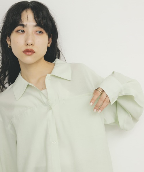 【体系カバーが叶いつつ、涼しさを兼ね備えた万能シャツ】 涼しげなドライタッチを使用した、程よくシアーのあるシャツ。体形カバーが叶い、細く見えるよう縦長のシルエットにしました。首元がすっきりと見えるように開き具合にこだわり、裾スリット仕様が程よい抜け感を演出します。 COORDINATE イージーパンツやサテンパンツを合わせたリラクシーさのある着こなしが◎定番ボトムとももちろん好相性ですが、盛夏の日差しや冷房対策にも適してるのでロングスパン活躍します。 【2025 Spring/Summer】【25SS】 ※この商品はデザイン上、モノフィラメント糸を使用しております。特にお肌の弱い方は下に1枚着用することをおすすめします。 ※商品画像は、光の当たり具合やパソコンなどの閲覧環境により、実際の色味と異なって見える場合がございます。予めご了承ください。 ※商品の色味の目安は、商品単体の画像をご参照ください。 ▼お気に入り登録のおすすめ▼ お気に入り登録商品は、マイページにて現在の価格情報や在庫状況の確認が可能です。 お買い物リストの管理に是非ご利用下さい。 素材感 透け感 : あり(IVORY, L.GREEN), ややあり(BROWN) 伸縮性 : なし 裏地 : なし 光沢 : ややあり ポケット : あり one