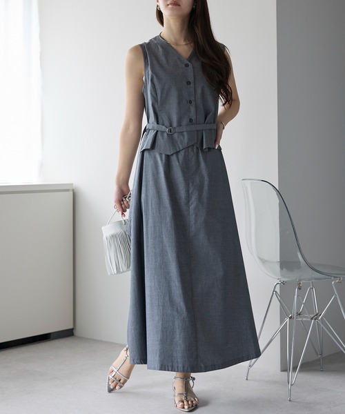 ◆オフィスで大活躍する◆ ジレにスカートを着ているようなセットアップ見えするレイヤードワンピースをリリースしました。 これからの季節、デート、旅行、オフィスでも大活躍してくれるワンピースです。 ◆Design◆ ジレを着ているようなトップ部分は前開きで脇から後ろにかけてスカート部分とつながっています。 マニッシュなデザインもウエストからスカートのすそにかけて流れるようなシルエットは着るだけで女性らしさが際立ち、周りの視線を釘付けにしてくれる。 ウエストはゴムシャーリング仕様で女性らしい「フィット&フレアー」なシルエットに仕上げました。 ◆Styling◆ そのまま着用したりインナーにTシャツ、ブラウス、シャツ、ニットを着用してレイヤードでコーディネイトが楽しめます。 ◆おすすめシーン◆ 旅行、デート、ショッピング、オフィスカジュアルでお仕事にも。 上品な色合いとモードな雰囲気で、どんなシーンにもマッチします。 ・洗濯:手洗い可