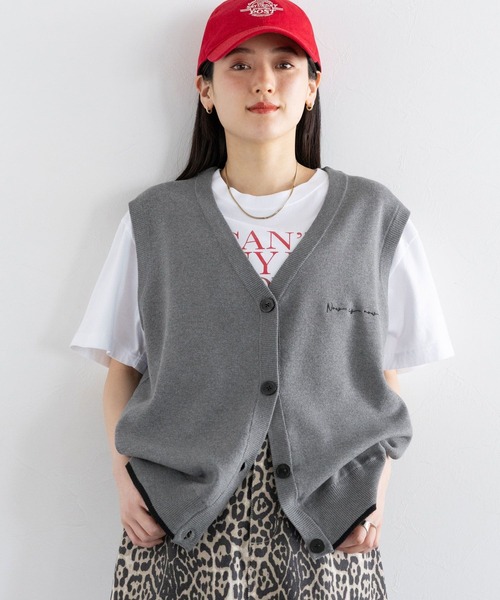 着回し力抜群なニットベストが登場! ■おすすめの着こなし ☆今年らしい、カジュアルな着こなしには・・・ ルーズなサイズ感のTシャツにレイヤードし、ボトムスはハーフパンツ等で肌見せするのがおすすめ。 もちろん定番のデニムスタイルとも、相性抜群です。 足元はスニーカー等でラフに合わせるのが◎です。 ★クリーンな着こなしには・・・ スラックスやフレアスカートなどのきれいめなボトムスと合わせるのが◎ インナーはTシャツのままでも、ボトムス次第で印象が変わります。 暑い季節はタンクトップ等をインナーにしていただくのもおすすめです。 ーーー ■ポイント シンプルデザインで着回ししやすいニットベストが登場。 ベーシックなグレーとネイビーの2カラー展開なので、落ち着いた印象で着ていただけます。 胸元にはワンポイント刺繍が施されているので、スタイリングのさりげないアクセントに◎ 深めのVネックデザインで仕上げているので、顔回りのすっきり見えも叶います。 幅広いアイテムと相性が良く、ボトムスを選ばずに着れる1着です。 ■素材 綺麗見えするポリエステルとコットンの混紡素材を使用。 柔らかく、肌触りも良いので、着心地抜群な1着です。