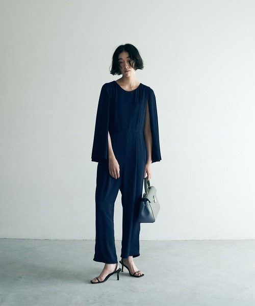 袖がマントのようなデザインになったオールインワンタイプのパンツドレス。 すらっとしたIラインシルエットで一見サイズ感を心配するように見えますが、実は程よくゆったりとしていて体のラインをさりげなくカバーしてくれます。楽なのに着痩せして見せてくれるオールインワンです。 素材は揺れ感のあるマットなジョーゼット系の生地を使っています。 シワになりにくくプレーンで綺麗めな印象のもの。余計な光沢はないので近くで見てもチープ感のない素材を選んでいます。 袖がなくジャケットを肩掛けしたような見え感でこなれて見える感じもあります。 二の腕を隠しながら少しだけ肌を見せて抜けを作っているので露出が少ないですがとてもバランス良く仕上がっていますよ。 生地にストレッチはないのですがゆったりしたシルエットなので着心地はとても楽ちんです。 背中は長めなコンシールファスナーでヘアセットやメイクをした後の着脱も楽にできますよ。 ※4/4追加分より生地を変更しました。厚みや揺れ感はほぼ同等の生地です。 [着用時期]真冬以外のオールシーズン [透け感]なし [生地の厚み]薄手 [ストレッチ]なし [生地のやわらかさ]やわらかい [生地の特徴]マットなジョーゼット系の綺麗め素材 [落ち感]あり [着用ジワ]なりにくい [ポケット]有(サイドポケット) [身長]全ての方に(身長によって着丈が変わります) ※感じ方には個人差がございますので気になる部分がありましたらお気軽にお問い合わせください
