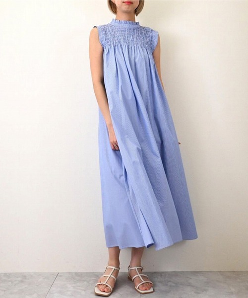 先染めストライプの素材感が魅力のシャーリングノースリーブワンピース!これ一枚で今季らしいこなれ感を演出します。大人女子の可愛さを引き立たせるマストアイテムです。