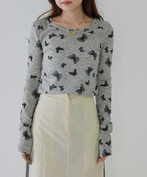 存在感抜群!蝶柄プリントが目を引くトレンドライクなロングスリーブカットソー。 ・ モノトーンで仕上げたバタフライプリント 甘すぎないグラフィックで、 大人ガーリーにもストリートにもマッチ。 ・ 伸縮性のあるリブ風素材 身体に優しくフィットしながらも着心地らくらく。 レイヤードにもおすすめ。 ・ 絶妙な丈感&細見えシルエット ハイウエストボトムと好相性で、 自然なスタイルアップを叶えます。 【おすすめコーディネート】・デニムやカーゴパンツでY2K風に・ミニスカートと合わせて甘辛ミックスに・シアーアイテムとのレイヤードで旬スタイルも◎ ----------------------------------------------------------------- ▼商品のお気に入り登録 お気に入りアイテムの値下げ・再入荷・在庫1点などの通知を受け取ることができます。 ▼ブランドのお気に入り登録 新商品や再入荷、セール、クーポン配布などお得な情報を受け取ることができます。
