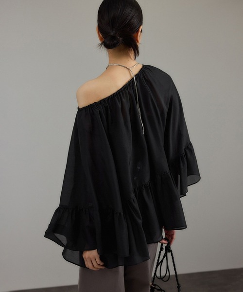 軽やかな着心地と抜け感あるネックが夏の大人コーデに最適。華やかなギャザーフレアが印象的なコットンシルクブラウス■デザイン/シルエット 贅沢なギャザーフレアが華やかに揺れる、たっぷりとした分量感が魅力のフレアブラウス。 軽やかな素材で動きのあるシルエットを演出しつつ、体型カバーも叶う優秀アイテムです。 ネックラインはオールゴム仕様で、オフショルダーやワンショルダーなど着こなしアレンジも自在。 鎖骨を美しく見せる絶妙な開き具合が、抜け感と華奢見えを両立します。 広めの袖口と七分袖のバランスが涼しげで、夏でも腕を出したくない方にもおすすめ。 エフォートレスな低めの切り替え位置で、大人のリラックス感を漂わせます。 ■素材 繊細な光沢と滑らかな肌触りが魅力の、コットン×シルクローン素材を採用。 細番手のコットンにより軽やかでナチュラルな風合いと、シルクの品のある透け感を両立。 夏にうれしい通気性とストレスフリーな着心地で、一日中快適に過ごせます。 洗練されたシャンブレーブラウン、鮮やかに映えるバーミリオンオレンジ、シックなブラックの3色展開。 ご自宅で手洗い可能なイージーケア素材です。 ■コーディネート デニムやカーゴパンツとのカジュアルミックススタイルはもちろん、 イージーパンツでリラックス感を出したコーディネートもおすすめ。 ナロースカートとの合わせでフェミニンさをプラスするのも◎ ブラウスのフレア感を活かして、ウエストインすれば視線が上がりスタイルアップ効果も。 真夏も快適で映える万能トップスは、ワードローブの主役になる1枚です。 ■モデル身長:166cm 着用サイズ:F ----------------------------- 裏地:なし 光沢感:わずかにあり 透け感:あり ポケット:なし 伸縮性:なし 生地の厚さ:薄手 その他仕様:襟ぐりゴム -----------------------------