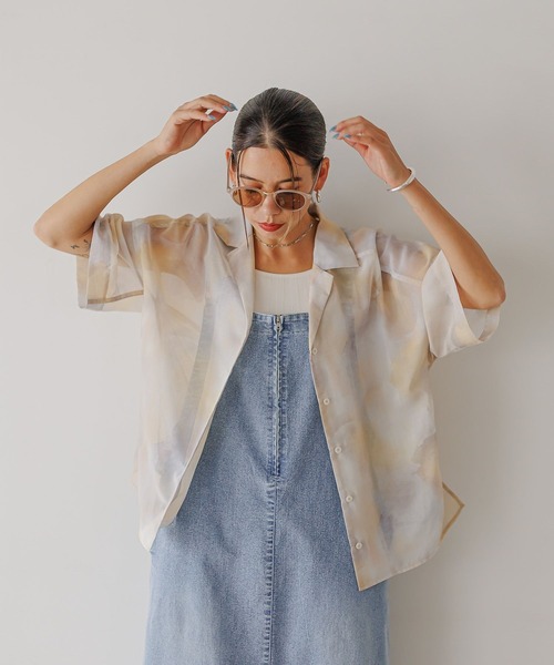 ゆるめシルエットで、コンパクトに仕上げたアート柄の半袖シャツーーー★おすすめポイント★[1]やわらかく、透け感のあるシアー素材[2]長すぎない丈感でどんなボトムスとも合わせやすいデザイン[3]すっきり見えするオープンカラーの襟[4]サイドにスリット入りーーー[fabric]透け感のあるシアー素材にぼかしアート柄をプリントした落ち感のある生地を使用。しなやかでやわらかい肌触り。[design]ゆるめのシルエットで、長すぎない丈感と袖とのバランス感がポイント。襟はオープンカラーデザインで、すっきり前立てのないフロントでシンプルに、両サイドのスリットで軽さをプラス。BAYFLOWのロゴ入りボタン使用。イエローやピンクカラーを差し色にした3色展開。[styling]無地アイテムとコーディネートがおすすめ。羽織としても、一枚でアクセントアイテムとして鮮度UPできるアイテム。※屋外での撮影画像は光の加減で実際の商品より明るく見えたり、風合いが異なって見える場合がございます。 商品の色味はスタジオ撮影の画像を参考にして下さい。-------------------------------------≪お買い物をよりお楽しみいただくために≫◆商品のお気に入り登録(ハートマークをクリック)完売カラーの再入荷通知や、完売間近の通知、セールの通知も受けることができます。◆ブランドのお気に入り登録新商品や再入荷など、いち早くブランドのお得な情報を受け取ることができます。-------------------------------------