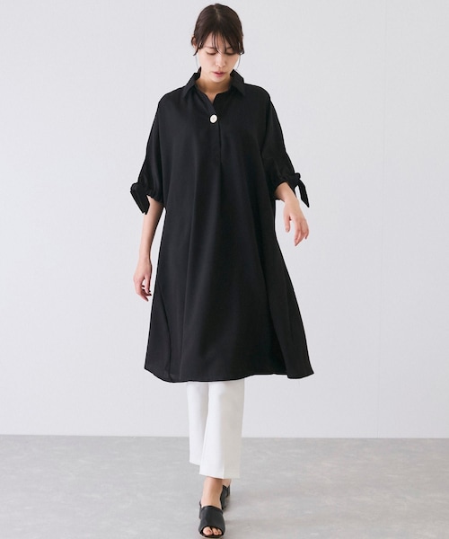 【デザイン・シルエット】 さらりとした風合いが心地よい、襟付きのシャツワンピース。 袖口のリボンデザインがフェミニンなアクセントに。 ゆったりとしたシルエットで、リラックス感のある着こなしが叶います。 前後差のある裾ラインが動きに表情をプラスし、体型カバーにも◎。 【素材感】 さらりとした素材 【カラー】 01クロ 07グレー 27ベージュ 30グリーン 31ダークグリーン 40コン 45ブルー 46ブルー系 61レッド 67ワイン 76レンガ 80イエロー 【スタイリングポイント】 細身のボトムに合わせるのがおすすめ◎ デニムやテーパードパンツに合わせて大人可愛いコーディネートを。 裏地:なし 光沢感:なし 透け感:あり ポケット:なし 伸縮性:なし 生地の厚さ:薄手〜普通 ボタン:あり その他仕様:なし 季節:春夏 ※撮影時の光、お使いのモニター環境によって色の見え方が違う場合がございます。予めご了承ください。 モデル身長:168cm 着用サイズ:F
