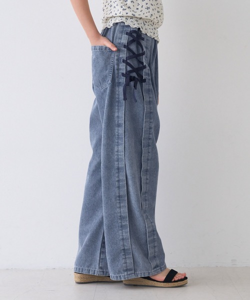 片側だけレースアップ仕様のデザイン。 レースアップ部分は、縫い止めていて、解ける心配がありません。 ゆるっとしたややワイドのシルエットでこなれ感があります。 伸縮性:ウエストのみあり 透け感:なし 裏地:なし ポケット:あり 生地感:柔らかいデニム生地 注意点:素材の特性上、色落ちが避けられません。淡色系との組み合わせはご注意下さい。また、洗濯などにより色や風合いが変化します。必ず単独で洗濯して下さい。 お洗濯方法によっては縮みや色あせの可能性あり。乾燥機等のご使用はお控え下さい。 ▼生地や素材の性質により2cm前後サイズ誤差が出る場合がございます。 ▼モデル着用写真は撮影環境により、多少実際のカラーと異なる場合がございます。 ▼色落ちの恐れがありますので、他のものと分けて洗って下さい。 ▼当商品は機械による生産の過程上、『生地を織る際の糸の継ぎ目』や多少の『ほつれ』、繊維の『混紡』、形やサイズに多少の『誤差』が生じる場合がございます。 ジュニア ボトムス パンツ デニム ウエストゴム シンプル リボン レースアップ ロング丈 女の子 ガールズ 120 130 140 150 コカ COCA coca COCA coca