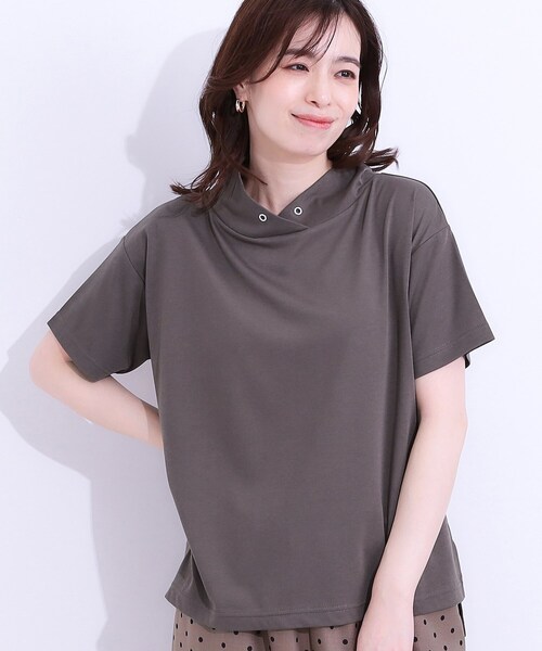 ひんやり・UVカット機能付きのデザインTシャツ 【デザイン】 程よくゆったりとしたシルエットで、抜け感のあるボリューム襟がポイントのTシャツです。 フード付きのようでフードではない、ワンテク効いたデザインです。 お袖は二の腕を隠せる半袖です。 【スタイリング】 裾は前後差があるので、インしない着こなしもサマになります。 テーパードパンツと合わせてゆるっとラフなスタイリングがおすすめ。 ナロースカートを合わせ、インスタイルで着ていただくとすっきりとした印象に。 シンプルなデザインなのでどんなボトムとも好相性です。 【お客様からいただいたコメント】 ・このタイプの襟が気になっていたので、試着。 着やすくて襟もあきすぎていないので思っていた以上でした。 色も黒ではないので、重たくなりすぎず良かったです。 (身長:160cm 体型:ふっくら チャコールグレーのLサイズ購入) とのお声を頂戴しております。 【素材】 さらっとした着心地の良いTシャツ素材。 ※触れた瞬間ひんやりする接触冷感、UVカット機能付き。 ※ポリエステルの一部にリサイクル糸を使用した環境にやさしい商品です。 【仕様】 ※この製品は、太陽光線中の紫外線(UV)を通しにくくします。この効果は永久的ではありません。 ※照明の関係により、実際よりも色味が違って見える場合があります。また、パソコン・スマートフォンなどの環境により、若干製品と画像のカラーが異なる場合もございます。 モデル情報:身長165cm B82 W60 H88 着用サイズ:02(M) 店舗へのお問い合わせ商品番号:741-12329 ●製品寸法: 01(S):着丈61cm B108cm 袖丈15cm 肩幅49cm 02(M):着丈63cm B110cm 袖丈15cm 肩幅50cm 03(L):着丈65cm B113cm 袖丈16cm 肩幅51cm 04(LL):着丈67cm B116cm 袖丈17cm 肩幅53cm 備考: