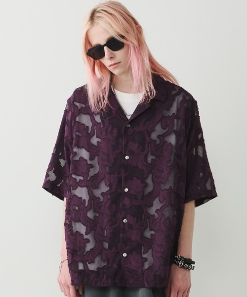【AFF AIVER シアーフリンジワイドシャツ】透け感のあるさらっとした柔らかい質感の上品な生地を使用。ジャガード織りを応用しフリンジと柄を全体にデザイン。裏面は生地の端が出ないように端は内側に織り込んで縫製した綺麗な仕上がり。また肌に触れた時のざらつきがなく柔らかくさらっとした軽い着心地。フリンジ、柄と透かしを組み合わせたデザインが特徴の半袖開襟シャツ。単色で仕立てつつも生地の凹凸、透かし色と柄部分の出方がアクセントに。カラーによってデザインが異なり、ブラックとパープルは総柄、ダークブラックとダークブルーはフリンジで仕立てた2種類。背中のヨーク部分は2枚仕立てにし後ろからネームの縫い目が出ない仕様。ボタンには黒蝶貝の品のあるボタンを取り付け首元は涼し気なオープンカラーを採用。着丈は長さを抑えワイドなシルエットのゆったりとしたサイズ感。<問い合わせ番号/FAPFF252001/FA00000024>【AFF AIVER/エイエフエフ アイバー】Anarchy / 51%realism主張がある中にも実用性を重視した表現する人の為の日常着a fucreation for AIVER※裁断の位置によって柄の出方がそれぞれ異なります。※引っ掛けや摩擦による毛羽立ち、糸切れが起こる場合がございます。お取り扱いにはご注意ください。※画像つきましては、光の反射などによって実物と色味が異なって見える場合があります。※商品画像はサンプルの為、色味やサイズ等の仕様に変更がある場合があります。※繊維製品の為1~2cmの誤差がある場合があります。予めご了承下さい。<商品のお気に入り登録>再入荷、残り1点、セールなどの通知を受け取ることが出来ます。<ブランドお気に入り登録>新商品や再入荷、ショップのおすすめトピックスなど、いち早くブランドのお得な情報を受け取ることが出来ます。