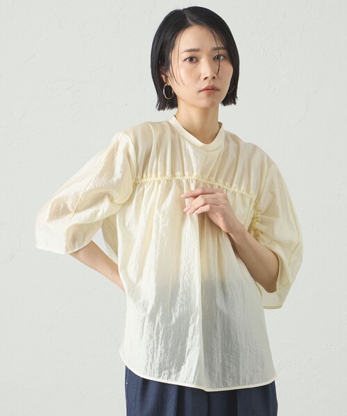 【1枚で着映える】ギャザーブラウス 【CAST:キャストコロン 2025年春夏アイテム】 【Design】 透け感と微光沢なキレイめの素材が目をひく、シャーリングブラウス。 腕から前身頃にかけてのシャーリングがデザインポイントです。 低めのハイネックデザインで、キレイめでモードな雰囲気を演出します。 【Fabric】 適度なハリと透けが特徴の素材を使用しています。 とても軽い仕上がりなので、夏の暑い時期にもぴったりです。 【Styling】 ふわっとした広がるデザインなので、すっきりとしたパンツスタイルとのこなれたコーディネートがおすすめです。 ●洗濯:手洗い可 透け感:あり 伸縮性:あり 生地の厚さ:薄い おすすめ着用期間:春、夏 ※この商品はサンプルでの撮影を行っています。 実際の商品とイメージ、サイズ、品質表示、原産国等が異なる場合がございます。 ※店頭及び屋外での撮影画像は、光の当たり具合で色味が違って見える場合があります。商品の色味は、スタジオ撮影の画像をご参照ください。