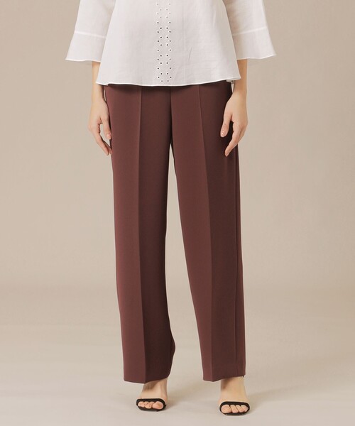 【ウォッシャブル】【着用推奨シーズン:春・夏・秋】 <素材説明> タテヨコ共にポリエステルとトリアセテートの合撚糸を使用し、膨らみのある風合いとドレープ性に清涼感が特徴の素材です。 <デザインポイント> スッキリとした腰回りと裾に向けてストレートに落ちるシルエットに、クリーズライン入りでシャープな印象のパンツです。きれいめな仕上がりですが、ウエストは総ゴム仕様で穿きやすいアイテムです。裏地なしです。