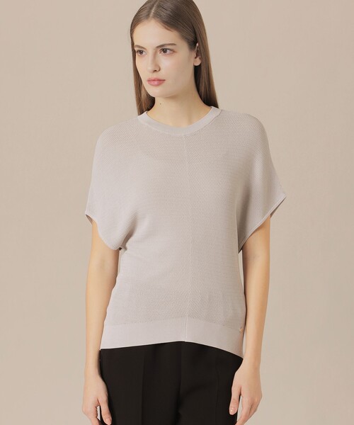 【ウォッシャブル】【着用推奨シーズン:春・夏】 <素材説明> さらりとしたドライなタッチと柔らかな風合いがバランスの良い素材です。光沢のある美しい表面感と、しなやかなストレッチ性による着心地の良さも魅力です。 <デザインポイント> きれいな落ち感と軽やかなドレープで、ニュアンスのあるリラクシーな雰囲気のニットです。二の腕をすっきり見せる袖丈と、ゆとりのあるシルエットにネックと裾はリブで締めてメリハリをつけ、上品にまとめています。ボディラインを拾わない程良い肉厚感で一枚でもインナーとしても活用するアイテムです。
