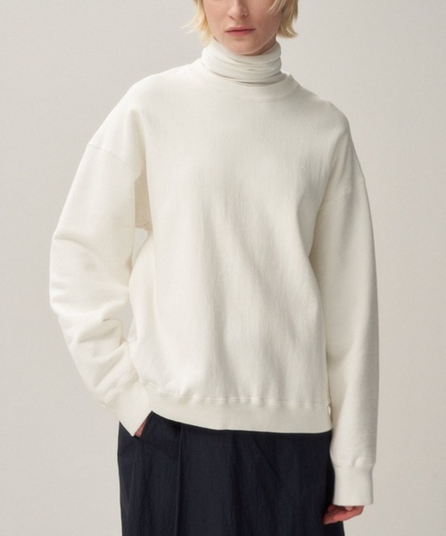 70年代のロサンゼルスの大学の購買部で売られていたカレッジトレーナーのヴィンテージを参考に作ったATON定番のトレーナー。袖口は力点を一点に集中させない様、リブをトライアングルに設計しており、機能を兼ね備えたデザインになっています。胸元に付いた、”A”マークは植毛フロッキーの為、剥がれること無くベルベットの様な手触りです。和歌山市で太番手の糸を通常の倍、限界まで高密度に編み上げたジャージー素材です。高密度に編み上げることで耐久性は勿論、製品染めをした後に、洗いをかけている為、縮みも起きません。裏毛は表面と裏面、その間を繋ぐ面の3層構造。間に空気を含む為、暖かさも兼ね備えています。