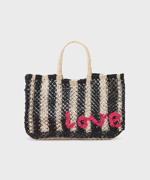 カラフルで可愛いデザインが印象的な「The Jacksons/ザ ジャクソンズ」のバッグが到着。ストライプ柄の本体にブランドを代表する手書き風のLOVEのメッセージがあしらわれた遊び心詰まった一品。しなやかなで丈夫な天然ジュート素材を、ハンドメイドで織り上げられた耐久性の高い一品です。横44㎝×高さ28㎝のやや大きめのサイズ感です。JACKSONS/ジャクソンズ 双子のデザイナー「ジョーイ&ルイーズ」がロンドンで立ち上げたジュートバッグを中心としたブランド。 2人が世界を旅して発見したものが作品のインスピレーションになっており、マクラメ編みのテクニックで 全てハンドメイドで製作されている。