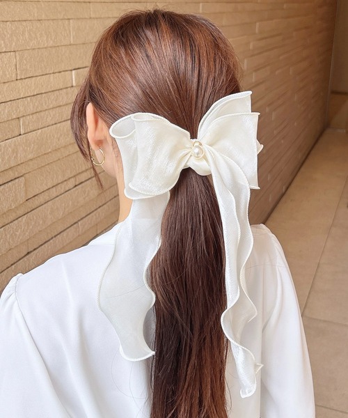 ラメを散りばめた大きなリボンがヘアスタイルを華やかに。 サッと付けられて使いやすいリボンデザインのシュシュです。 透け感のあるシアー素材のリボンが軽やかな雰囲気。 表情のあるメロウデザインもポイントです。 中央には歩く度に揺れるパールビジューがクラシカル。 普段使いはもちろん、お出かけシーンにもおすすめです。
