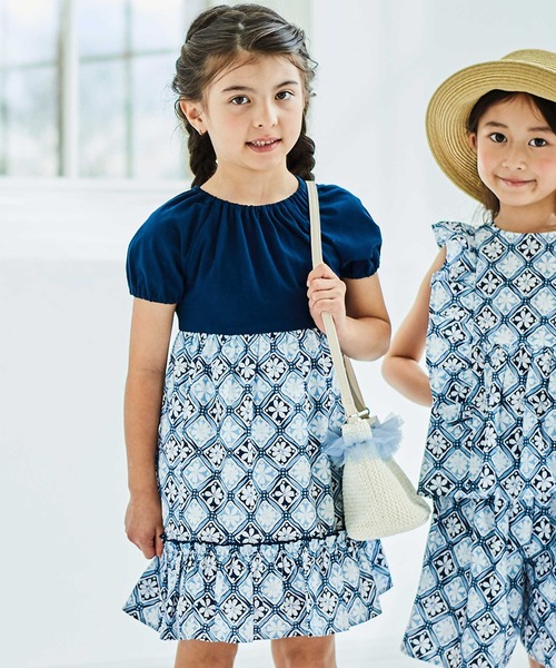 ゆとりのあるAラインのシルエットと裾のフリルが可愛らしい印象のワンピース。 1992年のコレクションからレトロな雰囲気がおしゃれなタイル柄がアーカイブコレクションとして登場。 すっきりとしたブルーのカラーが夏らしく上品なエスニックテイストになっています。 身ごろは柔らかな天竺のカットソーでスカート部分はさらりとしたローン生地になっています。 ギャザーたっぷりのパフスリーブはラグランスリーブの仕様で肩回りがラクチン。 首ぐりはゴム仕様になっているので被りで簡単に着られることもうれしいポイントです。 同じ生地を使用したブラウス(1106-73008)キュロット(1110-73058)フリルTシャツ(1115-73121)ボーイズシャツ(1106-73019)ボーイズTシャツ(1115-73143)も展開。 BEBEのベビーサイズブランド「フィヨ・デュ・ベベ・ルダクティオン」でも同素材を使ってアイテム展開をしています。 ※ウエスト部分ゴム仕様。 ※身幅と裄丈は首ぐりのギャザーによって多少の誤差が生じる場合がございます。ご了承ください。 ※柄の出方は生地の裁断により一点一点異なります。 ※100~150cmは両脇ポケットあり。 【4月 GIRL/BOY】 -アーカイブコレクション vol.2- 1992年サマーコレクションの柄を中心に復刻。 懐かしさのあるデザインが30年を経て新鮮に生まれ変わります。 ビーチの涼しげな雰囲気を爽やかなカラーリングとクラフト感で表現したリゾートムードなコレクションです。 【2025年春夏 シーズンテーマ】 -風のように- 青空に吹く 心地よい風。 そんな風のように 軽やかに背中を押してくれるファッション。 風に乗って 知らない世界を発見しに行こう。 【BeBe(べべ)】 ”LOVE MODERN” 少しおませで、生意気なヨーロピアンカジュアルの提案。 時代性・流行性をとらえ、ベーシックでもワンポイントを施した遊び心、楽しさを盛り込んでいます。 シンプルだけど、こだわりのあるオリジナリティーを重視しています。 2025年 春夏 女の子アイテム