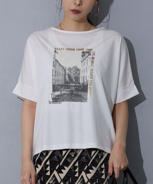 【フォトプリントTEE】 【Fabric】 肌触りのよいシルケットスムース生地 【Design】 コーディネートになじみやすいフォトデザイン×箔ロゴプリントの上品な大人デザインTEE。 後ろが少しラウンドしているので程よく縦長効果も。 【Styling】< デニムパンツやボリュームのあるスカートでカジュアルに、スラックスやタイトスカートと合わせて大人シックコーデと、幅広いコーディネートを楽しめます。 ------------------------- ■透け感:淡色若干 ■裏地:なし ■伸縮性:なし ■光沢感:なし ■生地の厚さ:普通 ------------------------- ☆★お買い物をお楽しみいただく為に★☆ ★商品のお気に入り登録 完売カラーの再入荷通知や、ラスト1点の通知、 セールの通知も受け取ることができます。 ★ブランドのお気に入り登録 新商品や再入荷等、ブランドのお得な情報を いち早く受け取ることができます。