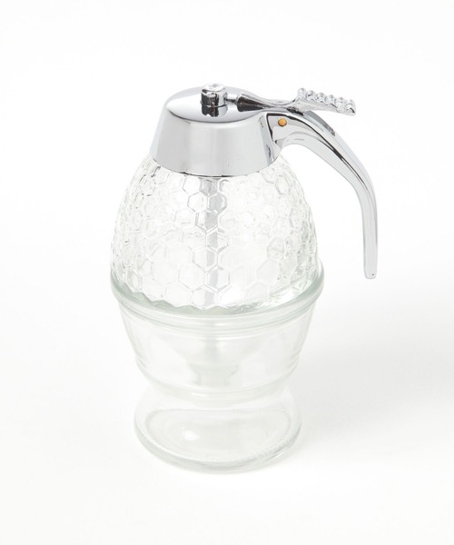 蜂の巣をモチーフにした六角形の柄がかわいらしいガラスハニーディスペンサーです。 ぽってりとした丸みを帯びたフォルムでテーブルを華やかな印象に。 ハンドルを持ち、レバーを押し下げると本体の下からハチミツがでてきます。 容量:210ml