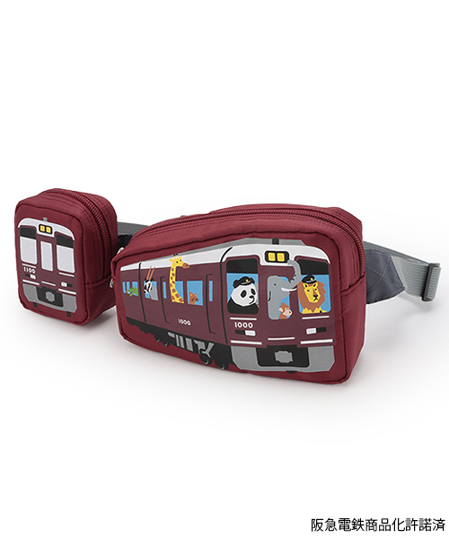 阪急電車1000系の車両をモチーフにしたマルーンカラーのボディバッグです。大阪万博の訪日外国人にも喜んでもらえるように、さまざまな国に生息する代表的な動物たちを乗車させました。車両のグレーの部分はリフレクタープリントなので、暗い道でも安心。ショルダーはお好みで長さの調整が可能です。お名前ネームがついています。≪重さ≫F/約110g乗り物