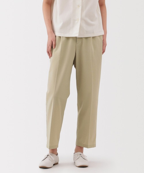 極小の通気孔をもった風通しの良い、涼やかな素材です。凹凸のある生地でさらりとした肌触りです。【素材】特殊な糸を使い、空気の通り道ができる繊維構造にすることで、高い通気性を実現しています。表面に凹凸のある生地は、さらっとしたドライな風合いで吸汗速乾に優れ、快適な着心地が続きます。さらに、ストレッチ性があるので、動きやすく楽に着ることができます。【デザイン】暑い夏にシーンを問わず履くことができるよう、センタープレスを入れ、前開き仕様に仕立てました。きれいめにもカジュアルにも着こなせ、Tシャツやブラウスとも合わせやすいテーパードパンツです。ウエストの後ろはゴム仕様になっており、快適な履き心地です。【仕様】透け感:ややあり伸縮性:ありフィット感:普通※ポケットについて型崩れを防ぐため、ポケットを仮止めしています。着用の際に糸を解くことで通常のポケットとして使用いただけます。【こちらもおすすめ】同素材の「オープンカラー半袖シャツ」とのセットアップもおすすめです。お取扱い上のご注意 : ●濃色製品は使用中の摩擦や濡れた状態での接触により色移りする事があります。洗濯の際は他のものと分けて洗ってください。お取扱い上のご注意2 : ●この商品は本体に再生ポリエステルを50%使用しています。お洗濯上のご注意 : ●アイロンはあて布を使用してください。お洗濯上のご注意2 : ●プリント部分はアイロンでこすらないでください。