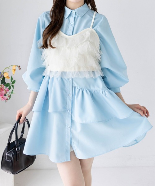 たくさん着まわせる!裾アシメシャツワンピース&ビスチェセット【デザイン】セットでも別々でもご着用いただけるワンピースとビスチェです。ワンピースはアシメな裾がポイントで、着るだけでオシャレ感がアップします!さらにフリルがたっぷりなチュールビスチェも可愛いポイントです♪【素材感】着心地の軽いポリエステル素材伸縮性:なし/ 透け感: ワンピースのみ若干あり/ 裏地:なし/ウエストゴム:なし 手洗いによる洗濯可 / ドライ・ウェットクリーニング可【コーディネート】セット合わせで、袖のボタンをアレンジしていただくのがオススメです◎またワンピース1枚でウエストリボンを締めたり、ビスチェはTシャツ合わせなど、様々なスタイリングをお楽しみいただけます♪【※お取り扱い上のご注意】1:モニター環境等により実際の商品と多少色味が異なって表示される場合がございます。予めご了承下さい。2:屋外で撮影された商品は、天候により多少実際のカラーと異なる場合があります。商品のカラーはトルソー(マネキン)の商品画像をご参照ください。3:濃い色の商品は、お洗濯や摩擦等による移染にご注意ください。4:末永くご愛用頂く為に、アテンションタグ・洗濯ネームを必ずご確認の上、着用又はお取り扱い下さい。5:生産時期により、色、サイズ、デザイン、素材の質感が多少が異なる場合がございます。あらかじめ御了承下さいませ。