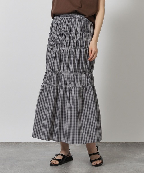 シャーリングデザインがポイントのスカート。 ウエストゴム仕様で着脱もしやすく、チェック柄がスタイリングのアクセントになる1枚です。 フレアなシルエットですがシャーリングでボリュームが抑えられほどよい細身のシルエットをお楽しみいただけます。 【素材】 綿100%の軽くて柔らかな素材感。 【スタイリング】 長めの着丈なので合わせるトップス選ばずスタイリングできます。 コンパクトトップスとはすっきりに、ロングトップスとはルーズな雰囲気で相性も〇