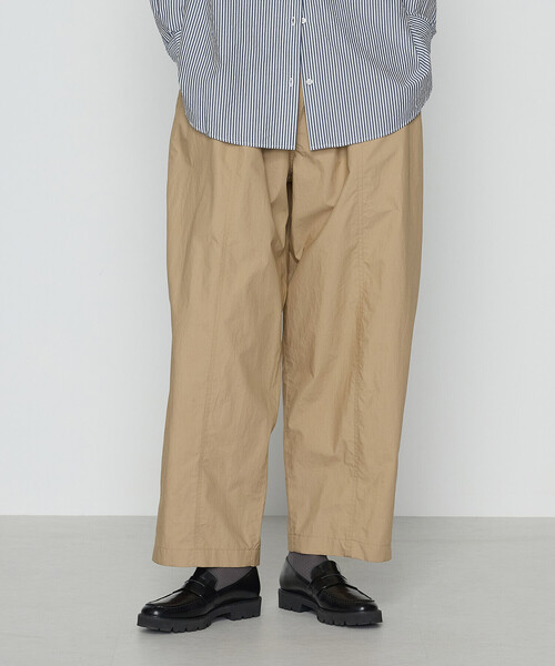 《デザイン》こなれ感を演出してくれるバレルパンツです。お尻や太ももまわり、膝まわりがゆったりとしているので体型カバーが叶います。切替えのステッチワークがポイントです。ウエストオールゴムで楽ちんな履き心地です。ウエストに紐が入っているので、お好みのサイズに調節して頂けます。肌離れが良く、汗ばむ季節に最適です。短め丈のトップスでシルエットにメリハリをつけたり、オーバーサイズのストライプシャツでバランス良く合わせるのがおすすめです。《素材》高密度でマットな表面感のコットンタイプライター素材です。シリコン含浸加工によるしなやかな反発感のある風合いと、さらっとした肌触りが特長です。ワッシャー加工を施すことで程良いリラックス感をプラスします。