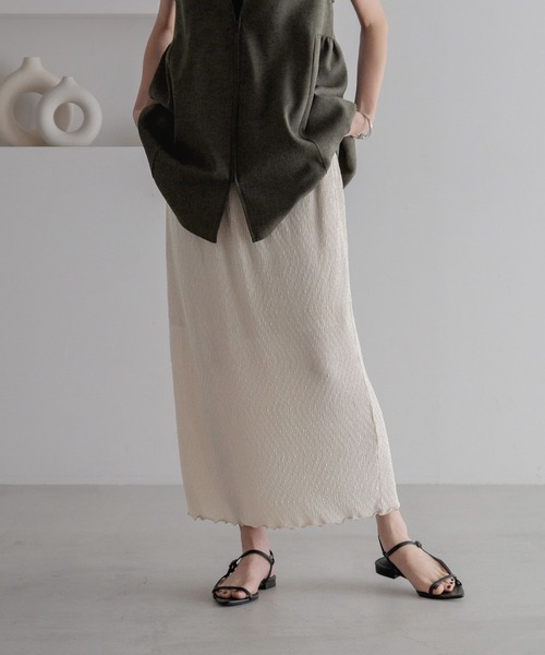◆素材◆上品な光沢と繊細なプリーツが特徴のスムース生地です。軽く、優しい肌触りでストレスフリーに着用頂ける素材になります。◆デザイン■タイトシルエットですが程良くゆとりのあるサイズ感のタイトスカート。ウエストはゴムと内側に紐が入っているのでサイズ調整も可能です。後ろ裾にはスリットが入っているので足さばきも良く伸縮性がある素材のタイトスカートなので履き心地抜群です。◆スタイリング◆シンプルなタイトスカートなので、様々な場面で活躍します。オーバーサイズのトップスと合わせてもすっきり見えるシルエットなので、ゆったりとしたTシャツやシャツなどとのスタイリングがオススメです。