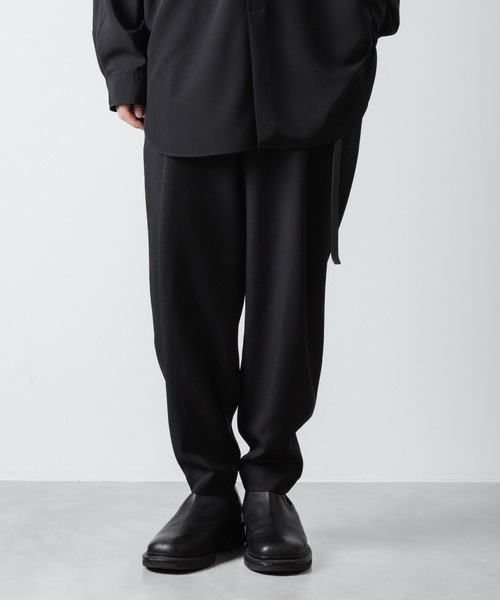 リサイクル・ポリエステル糸を100%使用した深めに入ったタックが印象的なテーパードトラウザーズ。肌触りが良くサラッとしていて1年通して着用できます。ヒップからワタリにかけてはゆったりとさせ、そこから裾に向けて強めのテーパードシルエット。立体裁断ならではの大胆なカッティングになっています。フロント入れた深めのタックはシルエット作りに貢献しています。トップスをタックインしてもアウトしても、一枚で存在感のあるデザインになっています。素材リサイクルポリエステル糸を100%使用した、サスティナブルな素材。やや薄手のツイルで、程よい落ち感とソフトな風合いが特徴です。上品な印象のルックスで、メランジ感のあるカラーを一部展開しております。吸汗性や速乾性、ストレッチ性などに優れている多機能素材です- ato -アトウでは身体を個性の象徴と捉え、一つ一つのパターンにこだわりを持ち服作りに取り組んでおります。全てのアイテムを立体裁断で作っているのも、フォルムはデザインであり、また身体という個性を意識させるシルエットを目指しているからです。男性らしさ、女性らしさに捉われて一本のラインを引くことなく、「個々の個性を引き出す」という考えのもと物作りを行っております。また、アトウでは服の全てにパタンナーネームをつけております。これはデザイナーだけではなくパタンナーなどスタッフ一人一人が「良い服を作る」という目的のもと、個性を生かした服作りを行っている象徴でもあります。