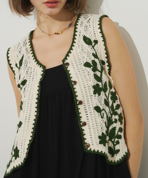 ブランケット刺繍のデザインが特徴的なサマーニットベスト柔らかく伸縮性のある夏に嬉しいサマーニット素材で、快適な着心地に。ほんのり透け感があり、軽やかな印象をプラスしてくれます。2種類の編地が組み合わさったデザインに葉っぱの刺繍デザインが特徴的なアイテムコンパクトなサイジングでメイントップスとしてはもちろん、キャミワンピースやオールインワンと組み合わせてジレとしても活躍します✓着用モデル174cm■concept■vintage moodとcontrastをキーワードに個性的なアイテムと旬なカジュアルアイテムをミックスさせたオリジナリティ溢れるスタイルをご提案いたします。〈公式Instagram〉@unitage__official------------------------透け感/あり光沢感/なし伸縮性/なし裏 地/なし------------------------※詳細は商品タグをご確認ください。※商品の写真はサンプル品を撮影しておりますため実際の商品とは仕様や加工、サイズ等が若干異なる場合もございます。※屋外の光や照明の当たり具合で、実際の商品の色味とカラー別画像の色味に若干の違いが発生する場合がございます。 詳細画像と併せてご確認の上、ご注文いただきますようお願い致します。