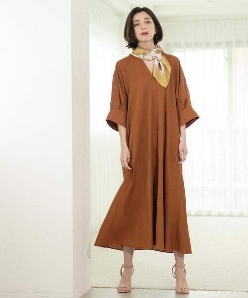 夏に向けて涼しく上品に着られる、レーヨン/麻のキーネックワンピース 【デザイン】 ・ネック周りをシャープに見せ、涼しく着ていただけるキーネックデザイン。 ・ラグランスリーブは着る方の肩になじむ設計で、ゆとりある袖周りとボリューム感がポイント。 ・やや低めの位置から切替を入れ、裾にかけてフレアに広がるシルエット。 ・長めの着丈設定でサンダルなどとの相性も◎ ・夏のおでかけや旅行にもさらっと1枚で決まるワンピースです。 【素材】 ・上品さのあるツヤ感と春夏らしい清涼感のあるレーヨン/麻素材。 ・さらっと落ち感もあり着心地も◎ ・表面感にふしやネップがありますが、麻の素材特性となります。 ・ハンドウォッシャブルでご自宅での手洗いが可能。 【仕様】 ・ポケット数:横×2 ・裏地なし ※照明の関係により、実際よりも色味が違って見える場合があります。また、パソコン・スマートフォンなどの環境により、若干製品と画像のカラーが異なる場合もございます。 モデル情報:身長165cm B72 W57 H84 着用サイズ:38(M) 店舗へのお問い合わせ商品番号:637-52040 ●製品寸法: 38(M):着丈124cm B105cm 裄丈58cm 40(L):着丈127cm B108cm 裄丈59cm 42(LL):着丈127cm B111cm 裄丈60cm 備考: