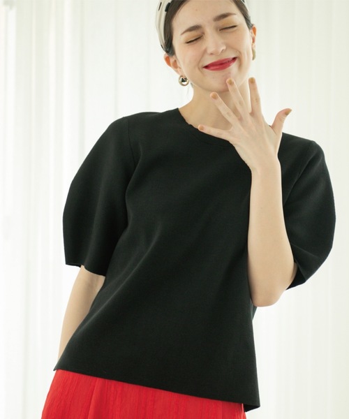 きれいな表面感のコットン混素材で上品に見せてくれるカーブスリーブニット【デザイン】・ラウンドネックで立体感のあるカーブスリーブがポイントのニットプルオーバー。・身体に張り付きにくく、程よくすっきり見せてくれるシルエット。・5分袖で二の腕もカバーしてくれる袖丈とデザインも魅力。・スカートでもパンツでもどんなスタイリングにも合わせやすいニットです。・きれいめに通勤にも最適なニットです。【素材】・きれいな目面と肌触りの良いコットン混素材のニットを使用。・細い番手に紡績する事で、より柔らかな肌触りと高感度のある表情を持ったニット素材です。・UVケア機能付き。・マシンウォッシャブルでご自宅でのお洗濯も可能。※この製品は、太陽光線中の紫外線(UV)を通しにくくします。この効果は永久的ではありません。※照明の関係により、実際よりも色味が違って見える場合があります。また、パソコン・スマートフォンなどの環境により、若干製品と画像のカラーが異なる場合もございます。モデル情報:身長165cm B72 W57 H84 着用サイズ:38(M)店舗へのお問い合わせ商品番号:637-12054●製品寸法:36(S):着丈54cm B88cm 袖丈27cm 肩幅33cm38(M):着丈56cm B92cm 袖丈28cm 肩幅35cm40(L):着丈58cm B96cm 袖丈29cm 肩幅37cm42(LL):着丈58cm B100cm 袖丈29cm 肩幅39cm備考: