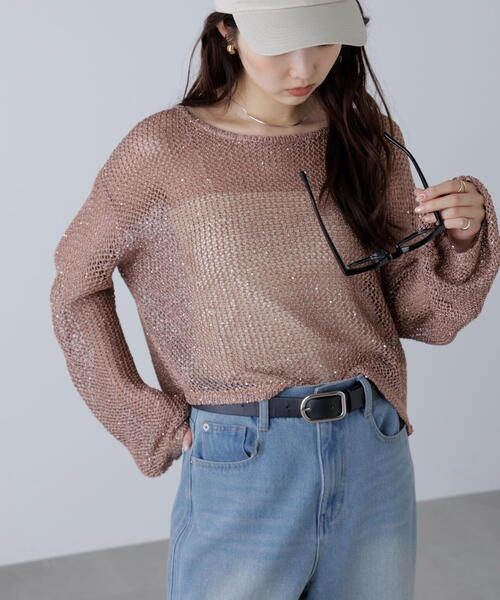大人気ニットの秋カラーブラウンとネイビー新色が登場! ◆デザイン 光沢のあるカラッとしたメッシュ編みに、小さ目なスパンコールでシャイニーさをミックスしたニット。 シンプルながらも華やかな1枚です。 身幅をたっぷりでルーズな抜け感のある、リラクシーな着こなしをお楽しみいただけます。 ◆スタイリング シアーインナーや薄手のニットカットとのレイヤードスタイルや、カップ付きベアキャミソールを合わせヘルシーな肌見せで、リラクシーなスタイリングもおススメです。 ■透け感:あり ■生地の厚さ:薄手 ■裏地:なし ■伸縮性:あり ■光沢:あり ■シルエット:ビッグ ※こちらの商品は131-5170049/◆メッシュスパンコールニットと同型商品でございます。 --------------------------------------------------- ◆商品のお気に入り登録◆ お気に入りアイテムの値下げ・再入荷・在庫1点などの通知を受け取ることができます。 ◆ブランドのお気に入り登録◆ 新商品や再入荷、セール、クーポン配布などお得な情報を受け取ることができます。