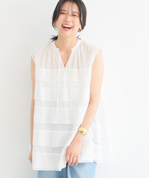 夏らしいフレアーシルエットブラウス ・フレアが重なった女性らしさを感じさせるブラウス ・肩先までかかるノースリーブとヒップの隠れる丈で安心感も抜群 ・揉み込んだ生地が薄手ながらも程よくふんわりした風合いに ・生地を重ねることで透けすぎず着まわしのきく一枚に 【スタイリング】 ヒップが隠れる安心丈なので細身のパンツでも、 軽やかさと女性らしさのある一枚なのでデニムやリラックス感のあるパンツでも素敵に着こなしていただけます。 【素材】 お手入れ方法:ハンドウォッシャブル 透けすぎない綿100%のローン生地に揉み込みの加工を施した軽やかな素材です。 【原産国】 中国 --------------------------------- 透け感:やや透ける 伸縮性:あり 生地の厚さ:普通 裏地:なし ※こちらは参考情報となります。カラーにより多少の誤差がございます。 ※ホワイトカラーで計測しています。 --------------------------------- お買い物をお得にもっと楽しく!上手な活用方法>>> ▼商品のお気に入り登録▼ 完売カラーの再入荷通知や、ラスト1点の通知、プライスダウンしたセール通知も受け取ることができます。 ▼ブランドのお気に入り登録▼ 新作や再入荷等、いち早くブランドのお得な情報を受け取ることができます。 【ご注意】 ※屋外の光や照明の当たり具合で、実際の商品の色味とカラー別画像の色味に若干の違いが発生する場合がございます。 詳細画像と併せてご確認の上、ご注文いただきますようお願い致します。 ※サンプルにて撮影をしておりますので、 実際の商品とは色味・仕様や加工・サイズ等が若干異なる場合がございます。 予めご了承くださいませ。