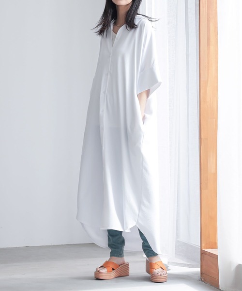 撥水加工で汗ジミ防止、着回し自在のロング丈シャツワンピ。汗を気にせず安心して着用できる、薄手でさらりとした布帛生地を使用。生地の両面に撥水加工を施しているため、汗をかいてもシミになりにくい。デイリーに使えて快適な着心地です。そのままサラッとワンピースとして着るのはもちろん、羽織り使いでレイヤードしたり、様々なスタイリングが楽しめます。ワードローブに取り入れるだけで、コーデの幅が広がります。袖丈はそのままでも、折り返しても着用可能。短めにロールアップすると涼し気ですっきりとした印象に。コーデのバランスに合わせて調節していただけます。両サイドにはポケット付き。カジュアルにもキレイめにも使えるカラー展開。系統やシーンに合わせてお選びいただけます。■機能性についての注意書き汗ジミについて加工は永久的なものではなく、洗濯や着用を繰り返すことで効果は弱まります。