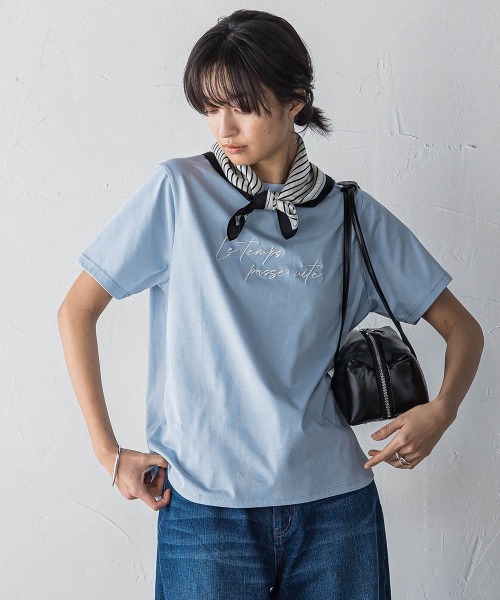 【デザインPOINT】繊細な手書き風メッセージがポイントのロゴTシャツ。刺繍のさりげない立体感が高見えするデザイン。「Le temps passe vite.」フランス語で「人生は有限/時間を大切に」という意味。ほどよいゆとりのある、セットイン袖のパターン。女性らしい印象のラウンドした裾、幅広いボトムにマッチする前後差ある丈感に仕上げました。【スタイリング】パンツにもスカートにも、バランス良くきまります。セットイン袖だから、ジレやジャケットのインナーにもすっきり◎【素材の特徴】【シルケット天竺】シルケット加工で毛羽立ちを抑えたクリアな表面が魅力の天竺カットソー。滑らかななタッチで、着心地が心地良い素材。----------------------------------洗濯方法家庭洗濯:液温は40℃を限度とし、洗濯機で弱い洗濯ができる。自然乾燥:日蔭の吊り干しがよい。アイロン:底面温度150℃を限度としてアイロン仕上げができる。ドライクリーニング:石油系溶剤による弱いドライクリーニングができる。----------------------------------■モデル身長 166cm 170cm / 着用サイズ M※画像の商品はサンプルとなりますので実際の商品と仕様、加工、サイズが若干異なる場合がございます。※お客様のモニター環境により実際のお色と多少異なる場合がございます。※撮影状況や光の当たり具合により、色合いが異なって見える場合がございます。----------------------------------▼商品のお気に入り登録ハートマークをクリックし、お好きなカラーを選んでお気に入りに登録完売カラーの再入荷通知や、ラスト1点の通知、セールの通知も受け取ることができます。▼ブランドのお気に入り登録新商品や再入荷等、いち早くブランドのお得な情報を受け取ることができます。----------------------------------