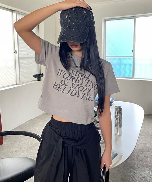 【着丈が調節出来るクロップドT】両サイドがドローコードでクシュクシュかわいい / サイド ドロスト クロップド ロゴプリント 半袖Tシャツ / y2k