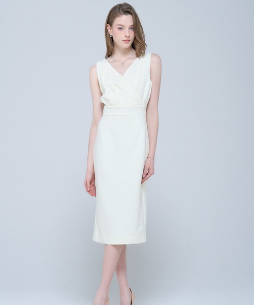 エレガントなカシュクールデザインが特徴的なタイトワンピース。 白と黒の2色展開で、シンプルでありながら華やかさを演出します。パッド入りでバストラインを美しく整え、スリットがさらに女性らしさを引き立てます。ウエストをすっきりと見せるカシュクールスタイルで、どんなシーンでも自信を持って着こなせます。