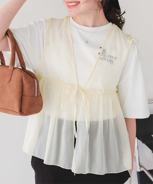 軽やかなシアー素材にたっぷりギャザーとリボンをあしらった、フェミニンムード満点のレイヤードベスト。 ■Point ・シアー素材×ギャザーデザイン:程よい透け感と裾の広がるシルエットが、女性らしい華やかさをプラス。 ・リボンディテールがアクセントに:前開きのリボン仕様で甘さと抜け感を絶妙に両立。 ・シーズンレスに活躍:軽やかな素材感で春夏は涼しげに、秋冬はインナー次第で印象チェンジも可能。 ■Coordination ・Tシャツやキャミとのレイヤードに:シンプルなトップスの上に重ねるだけで、旬なスタイリングが完成。 ・ワンピースと合わせて甘さUP:ナチュラルなワンピースの上に羽織って、こなれたフェミニンコーデに。 ・パンツスタイルでバランス良く:ボリュームのあるトップを引き締める、スキニーやテーパードパンツとも好相性。 1枚プラスするだけで、いつものコーデがぐっと華やかになる主役級ベストです♡ ※当商品は機械による生産の過程上、どうしても"生地を織る際の糸の継ぎ目"や多少の"ほつれ"、他繊維の"混紡"、また、形やサイズや柄に多少の"誤差"が生じる場合がございます。 ※サイズは、実寸サイズを測っているため多少誤差がでる場合があります。製造工程の関係上、各採寸箇所実寸(平置き)より【約-3cm~+3cm】程度は誤差の許容範囲とさせて頂いておりますので、予めご了承くださいませ。 ※メーカーより密封状態で入庫し、検品時に再度袋詰めを行っておりますが、素材により染料等の臭いが強い場合がございます。 ※発送上の状態によって商品がシワになる場合がございます。 ※商品により色落ち・色移りがある場合がございますので、品質表示をご確認の上、お取り扱いにご注意くださいませ。 【伸縮性】なし 【透け感】あり