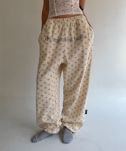 THE MYSTERIOUS HOTEL ミニフラワーモチーフがフェミニンな印象のイージーパンツ。 肌触りが良くしっかりとした厚みを感じるワッフル素材を採用。 トレンドのクロップド丈のトップスと相性抜群のワイドシルエット。 フロントにはゴシック調でブランドシグネチャーを刺繍でデザイン。 ビスネームを付ける事でストリートのエッセンスをプラスしてます。 THE MYSTERIOUS HOTEL|ザ ミステリアス ホテルは、SNSのフォロワー10万9000人を超えるインフルエンサーが立ち上げた韓国発のファッションブランド。LE SSERAFIMのメンバーが着用したことにより韓国現地で話題を集めている。日常生活で気楽に着られるヴィンテージスタイルに個性的なディテールをプラスしたアイテムを展開している。