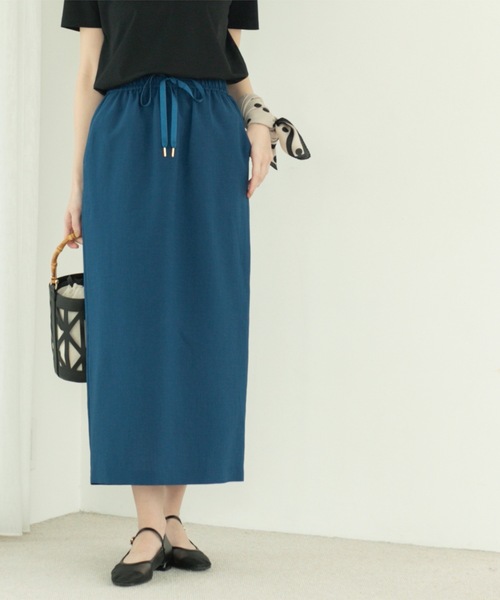 ウエストゴムのイージーな着心地がポイント! きれいめにもカジュアルにも着こなせるナロースカート 【デザイン】 ・ウエストはぐるりゴム仕様で楽な着心地。ドロスト使いでデザインにアクセントをつけました。 ・身体のラインを拾いにくい、きれいなナローシルエットがポイント。 ・深めの後ろベンツスリットで脚捌きも楽な穿き心地。 ・トップスインで、あえてウエストの紐を見せたカジュアルなスタイリングもオススメです。 【素材】 ・麻混素材のようなタッチが涼しげな、きれいめに着こなせるポリエステル素材。 ・クリーンできちんと感がありながら、お手入れしやすいイージーアイロン機能付き。 ・これからの季節に嬉しい、接触冷感、吸水速乾機能付きで、さらりと涼しげに着られる軽やかな素材感◎ ・マシンウォッシャブルでご家庭でのお洗濯が可能。 【仕様】 ・ポケット数:横×2 ・ウエスト総ゴム ・ウエストドロスト ・ショート丈の裏地あり ※裏地のない部分はやや透け感があります。 ※この製品は、吸水速乾効果のある素材を使用しています。この効果は永久的ではありません。 ※照明の関係により、実際よりも色味が違って見える場合があります。また、パソコン・スマートフォンなどの環境により、若干製品と画像のカラーが異なる場合もございます。 モデル情報:身長167cm B84 W62 H88 着用サイズ:38(M) 店舗へのお問い合わせ商品番号:637-72023 ●製品寸法: 38(M):総丈87cm W67cm H102cm 40(L):総丈89cm W70cm H105cm 42(LL):総丈89cm W73cm H108cm 備考: