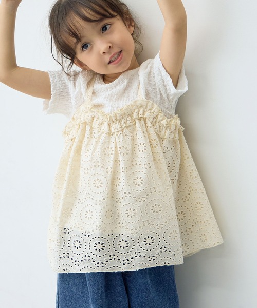 カットワークレースのキャミが付いたドッキングトップスが登場。 表面感のあるインナーがパッと目を惹く華やかなアイテムです。 1枚着るだけでおとなガーリースタイルが完成。カジュアルになりすぎず上品なアイテムです。 ※キャミは取り外し出来ません。 【コーディネート合わせアイテム】 オフホワイト:210538 レースキュロットショートパンツ ブラック:210530 カットシャーリング フリル セットアップ(パンツのみ) 【生地の伸縮性】 アウターなし/インナーあり 【透け感】 アウターあり/インナーややあり 【裏地】 なし 【生地の厚み】 アウターやや厚手/インナーふつう ※ご覧のモニター環境や撮影環境により実際の商品と多少色味が異なって見える場合がございます。 ●ブランド紹介● "ママも欲しいトレンドこども服" ファッション好きのママのためのトレンド感たっぷりのスタイル。 レディーストレンドをこども服に落とし込んだデザインで、 ママもキッズもいっしょに楽しめるファッションをご提案致します。 【お気に入り登録がオススメ!】 ●商品のお気に入り登録 「在庫残りわずか」の通知や、「完売カラーの再入荷」、「セール」の通知を受けることができます。 ●ブランドのお気に入り登録 新商品や再入荷等、ブランドのお得な情報を受け取る事が出来ます。 ※他のキャンペーンにより、期間中に価格が変動する場合があります。※セールは予告なく終了させていただく場合もあります。 ※ご注文いただいた予約商品のお届け時期の確認は、注文履歴ページより行えます。