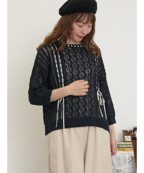 レースのような透かし編みと配色リボンが愛らしさを演出するニット。 ステッチ風なリボンがおしゃれなアクセントをプラスします。 前後どちらでも着用可能な2WAY仕様になっており、コーディネートの幅も広がるデザイン◎ カジュアルやガーリーなスタイリングにもマッチしてくれる1着です。 ※商品画像は、撮影環境やお客様のご利用のPC・スマートフォンのモニター環境などにより実物と色味に差異がある場合がございます。