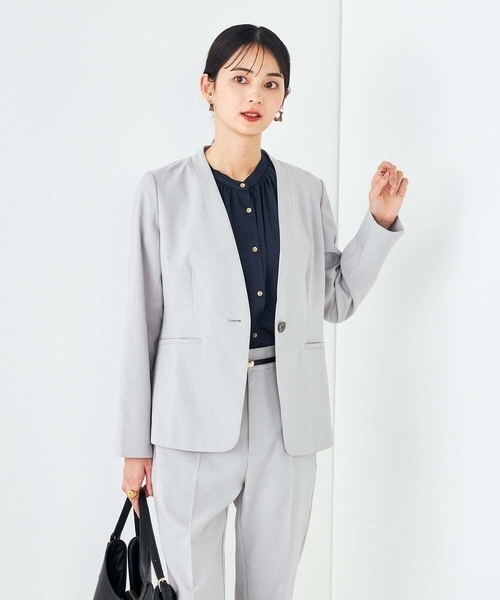 ◆扱いも着心地もラク!悩みの多い夏も快適な通勤服◆ 【デザイン】 ・定番人気のベーシックなノーカラージャケット ・麻のようなナチュラル感とドライな風合い ・胸元の開きがスッと綺麗に見えるVネックライン ・袖口は折り返しやすいスリット開き仕様 ・脇下に消臭効果のあるテープ付き! ・動きやすさ、着心地、美シルエットにこだわりぬいたパターン ・かしこまりすぎないきちんと感がありつつ、ケアも楽ちん! 【素材】 ・さらっとしたリネンライクなポリエステル素材 ・汗ばむ時期に嬉しい吸汗速乾、接触冷感素材 ・ストレッチ入りで動きやすくストレスフリーな着心地 ・ご家庭の洗濯機で洗えて、アイロンいらずのイージーケア ・毛玉になりにくい素材を使用 ・90%UVカットで夏の日差しにも◎ 【コーディネート】 同素材ボトムとのセットアップ着用で 春夏のきれいめお仕事スタイルが完成。 Vネックデザインはインナーの形を選ばずクルーネック~ハイネックまで どんなネックデザインのものとも相性が良いです。 通勤からおでかけはもちろん 七五三や発表会、学校行事まで幅広いシーンで活躍します。 【同素材シリーズ】 ノーカラージャケット:KBDGB30109 キーネックジャケット:KBDGB31109 テーラードジャケット:KBDGB32109 ダブルブレストジャケット:KBDGB33109 ジレ:KBJGB30089 テーパードパンツ:KBLGB30079 クロップド丈ワイドパンツ:KBLGB31079 ワイドストレートパンツ:KBLGB32079 フレアスカート:KBHGB30079 セットアップでお探しの際は上記品番をご確認ください。 ------------------- 透け感:なし 裏地:前身頃のみあり 伸縮性:あり 光沢感:なし 生地の厚さ:やや薄め -------------------- -------------------- ≪お気に入り登録機能の使い方≫ ■商品のお気に入り登録(ハートマークをクリック) 再入荷通知や値下げ等、お得なご案内を受けることができます。 -------------------- ※商品画像は、光の当たり具合やパソコンなどの閲覧環境により 実際の色味と異なって見える場合がございます。 商品の色味の目安は商品単体の画像をご参照ください。 ※34(XSサイズ)・42(XLサイズ)はWEB・一部限定店舗での販売です。