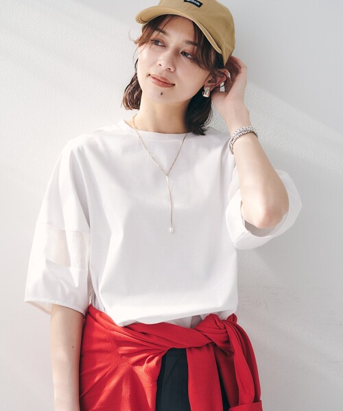 【デザイン】 袖にオーガンジーを切り替えたコクーンスリーブプルオーバー。 きれいめなシルケット素材のジャージにオーガンジー素材をドッキングし、デザインポイントに。 さりげなく腕が透けて涼しげな印象の一枚です。 【素材感】 スーピマ綿とサンホーキン綿を50%50%でMIXしたアメリカンコットン糸を使用したスムース。 ハイゲージに編立てシルケット加工と柔軟の組み合わせにより、ソフトで滑らかな風合いとクリアな表面感が特徴になります。 お袖に少しハリ感のあるポリエステルのオーガンジー素材を使用しています。 ※接触冷感機能付きです。 【着こなしポイント】 スカートにはインして着ていただくのがおすすめです、 ※照明の関係により、実際よりも色味が違って見える場合があります。また、パソコン・スマートフォンなどの環境により、若干製品と画像のカラーが異なる場合もございます。 モデル情報:身長161cm B79 W58 H86 着用サイズ:02(M) 店舗へのお問い合わせ商品番号:153-12502 ●製品寸法: 00(XS):着丈53cm B94cm 袖丈31cm 肩幅39cm 02(M):着丈57cm B101cm 袖丈32cm 肩幅41cm 04(2LT):着丈59cm B107cm 袖丈33cm 肩幅43cm 44(3L):着丈61cm B115cm 袖丈34cm 肩幅44cm 48(5L):着丈63cm B123cm 袖丈35cm 肩幅45cm 50(6L):着丈64cm B127cm 袖丈35cm 肩幅46cm 備考: