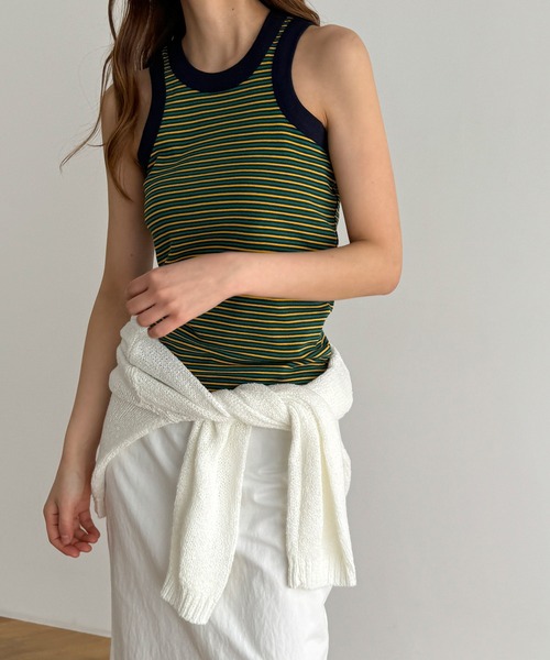 デザイン マルチボーダーと太めのパイピングがカジュアルな印象に。 ヘルシーかつ女性らしいスタイリングに仕上がります◎ 素材 身体に沿うシルエットですが、ストレッチ性があるのでストレスフリーな着心地です。 コーディネート インナーとしてはもちろん、夏には1枚着としても活躍。 デニムやワイドパンツと合わせた大人カジュアルに欠かせない1枚です。 ------------------------------------- 生地の厚さ:厚い〇〇●〇〇薄い 伸縮性:あり 透け感:なし 裏地:なし 光沢:なし ------------------------------------- 取扱い ・蛍光増白剤が入っていない洗剤をご使用ください。 ・クリーニングネットをご使用ください。 ・濃い色と白 ・淡色物は分けて洗ってください。 ・洗濯で多少縮むことがあります。洗濯後はすばやく形を整えて干してください。タンブラー乾燥はお避けください。 ・アイロンの際は当て布をご使用ください。 ・着用時の汗や摩擦により、他の衣類や鞄などに色移りすることがありますので、淡色系との着合わせはご注意ください。 ・摩擦や引っかけにご留意ください。 ※取り扱い及びお手入れ方法については、商品についている取扱表示、洗濯表示にてご確認下さい。 ※照明の関係により、実際よりも色味が違って見える場合があります。またパソコン・スマートフォンなどの環境により、若干製品と画像のカラーが異なる場合もございます。 ※商品の色味は、商品アップ画像をご参照ください。