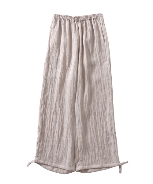 ■DESIGN ウエストゴムで裾には共布のスピンドルが通り、ブラウジングをしても着用可能なイージーパンツ。 さりげなく接ぎで入っているサイドラインがデザインポイント。 ヴィンテージ感のある表面感で、さらりとした肌触りとライトウエイトで着心地抜群。 夏の暑い時期にも最適な着心地で、シンプルな装いにこなれ感を演出するアイテムです。 --------------------------- 透け感:なし 裏地:なし 伸縮性:なし ケア方法:手洗い可 ※お洗濯の際は洗濯表示を必ずご確認ください。 ---------------------------