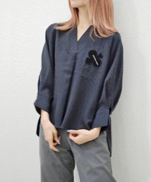 ON/OFFどちらもシーンを問わず上品に着こなせるクローバータックブラウス【Clover tuck blouse】POINT・袖のタックとボタンの細かいディティールで、これ一枚でも華やかになるスタイリッシュなデザイン!・お尻が隠れるくらいの長さに調整された、後ろ下がりの丈もこだわりのポイント♪・ON/OFFどちらも着回しの効くスッキリとしたシルエットがGood!素材/特徴・落ち感ある柔らかなポリエステル100%素材を使用。