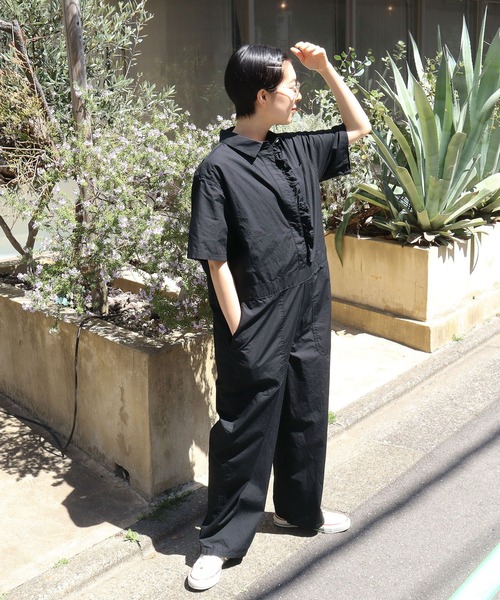 ●●● WEB LIMITED ITEM ●●● 一枚で着こなしが完成するワークな印象のオールインワンに、前立てにフリルをあしらいちょっぴりかわいらしいエッセンスを加えました。 タイプライター生地のブラックは、シックで落ち着いた着こなしにはまる一枚。(別ページ<5009PT002251>で経年変化が楽しめるカジュアルなデニム生地でもご用意しております。) ダブルステッチや大きいポケット、ウエストのベルトラインの切り替えなどワークなディテールはしっかりとありながらも、ボタンが見えないすっきりとした比翼仕立てに走るフリルや、ぽわんとしたふくらみのきれいなシルエットで、“女性が着やすいメンズライク”を目指しました。大きめの華やかなフリルも縦方向に付いているので、甘くなりすぎず程よい主張。オーバーオールは着たことがあるけれどオールインワンは初めて、というワークなスタイリングが気になる方にも挑戦しやすいアイテムです。 不純物や短い繊維を徹底的に取り除いた、糸ムラの少ないやや艶のある糸を高密度に打ち込んだタイプライター生地。夏のスタイリングに合うように、薄くても透けず、一枚で着た時のシルエットが綺麗に出るハリ感と、軽さがありながらもオールインワンの形にしたときにダレない落ち感のある生地を選びました。製品の形に仕上げてからさらに洗いをかけてタンブラー乾燥をしている為、ハリのある生地にナチュラルな風合いが出てこなれた雰囲気に。 さまざまな身長と体型の方に着ていただきやすいよう、裾を折り返したり丈詰めも可能なよう丈を長めに設定しました。身体のラインを拾わない、やや丸みを帯びたきれいなシルエット。ヨーク下のボックスタックで、バックからの見え方も立体的に。身幅とヒップに程よくゆとりを持たせたことで、Tシャツとのレイヤードもしやすい。カラーインナーと合わせて配色を楽しんだり、モノトーンコーディネートで凛とした着こなしにも。季節の変わり目は長袖を合わせて着回していただけます。 ※一部店舗に入荷する場合もございます。 ※別ページの<5009PT002251 / 【WEB別注】デニム フリルオールインワン>と同型です。こちらのタイプライターのページではフリーサイズ表記になっておりますが、デニムのページのMと同じサイズとなります。 -------------------- 透け感:なし 裏地:なし 伸縮性:なし 光沢感:なし ポケット:あり -------------------- 【素材の特性・お取り扱いの注意】 ・取り扱いの注意については取り扱い表示をよくご確認の上、着用をお願い致します。 ・汗や雨等でぬれた場合、摩擦などにより色落ちし、他の衣料に移染することがありますのでご注意下さい。 ※撮影画像は、光の当たり具合やモニターの環境により色味が違って見える場合があります。あらかじめご了承下さい。 ※詳細画像の前半にある白背景の着用画像はサンプルです。お届けする実際の商品と仕様、加工、サイズが若干異なる場合がございます。 サンプルの着用画像から総丈が2cm短く、襟ぐりが一周で7mm広くなります。